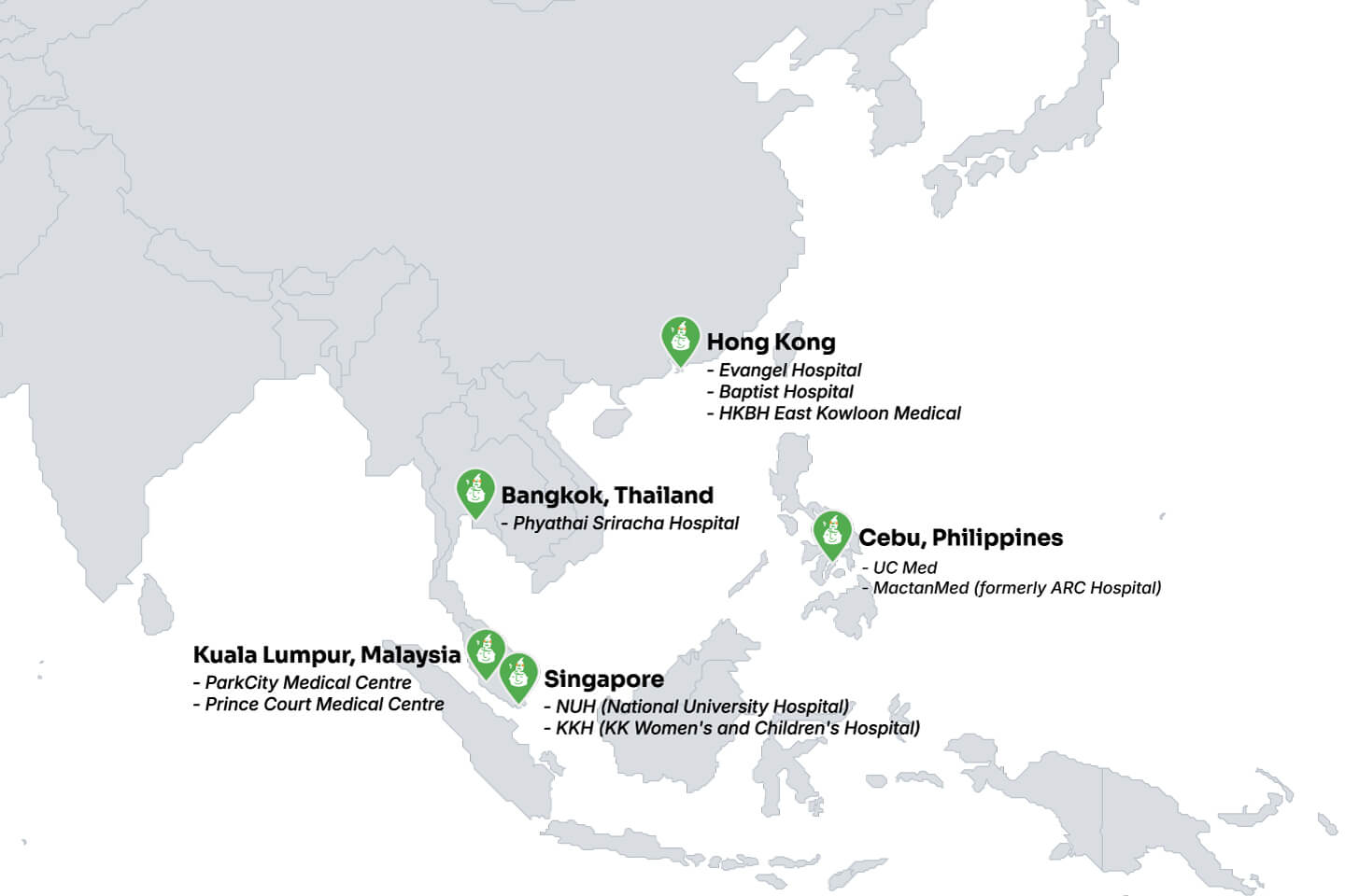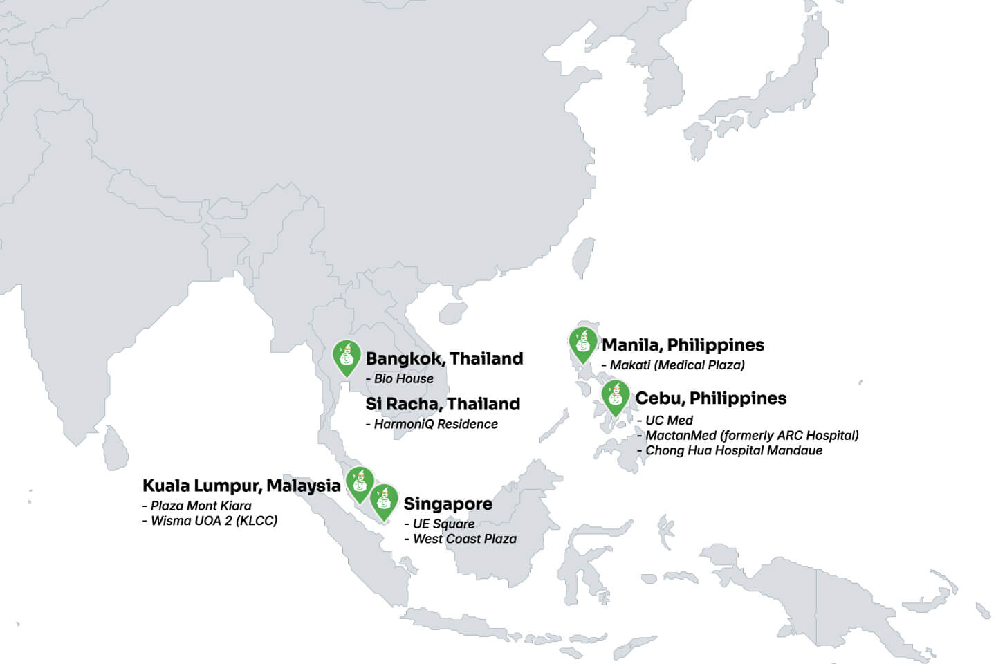 Healthcare hubs for Japanese communities across Asia. Japanese‑speaking staff familiar with local healthcare systems address the needs of each region.